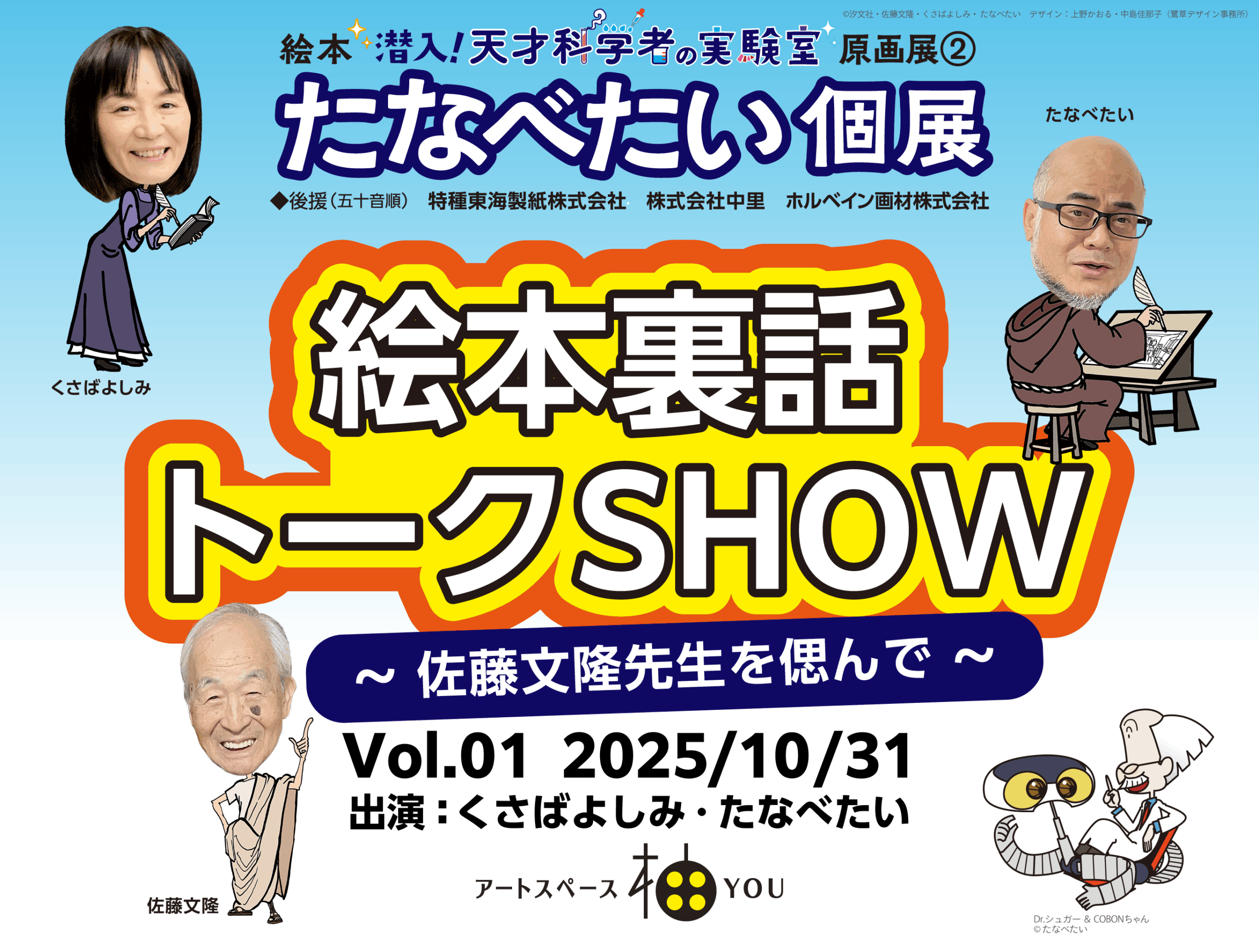 また同時開催致しました「科学者(佐藤文隆)×作家(くさばよしみ)×漫画家(たなべたい)=絵本裏話トークSHOW」にも定員を超える沢山の皆様がご参加下さいました。改めまして厚く御礼申し上げます。皆様から頂戴したご意見やご感想は私にとって望外の喜びでございました。