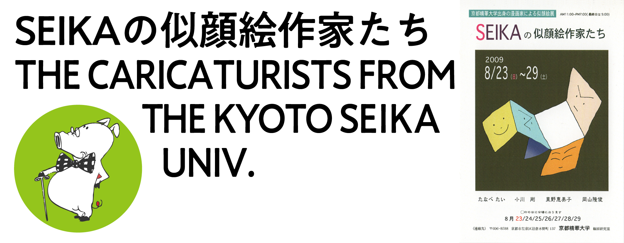 京都精華大学マンガ出身の似顔絵作家の方たちとのグループ展です。平安後期から鎌倉時代に流行した似絵[にせえ]を意識して、現代の著名人(2009年当時)に有職故実に基づいた衣装を着せて描いた似顔絵作品です。着物の柄や畳の縁などに、モデルにちなんだ模様を入れてみました。それぞれの持ち物も工夫を凝らしているので、その辺りも観て頂けると楽しめると思います。
