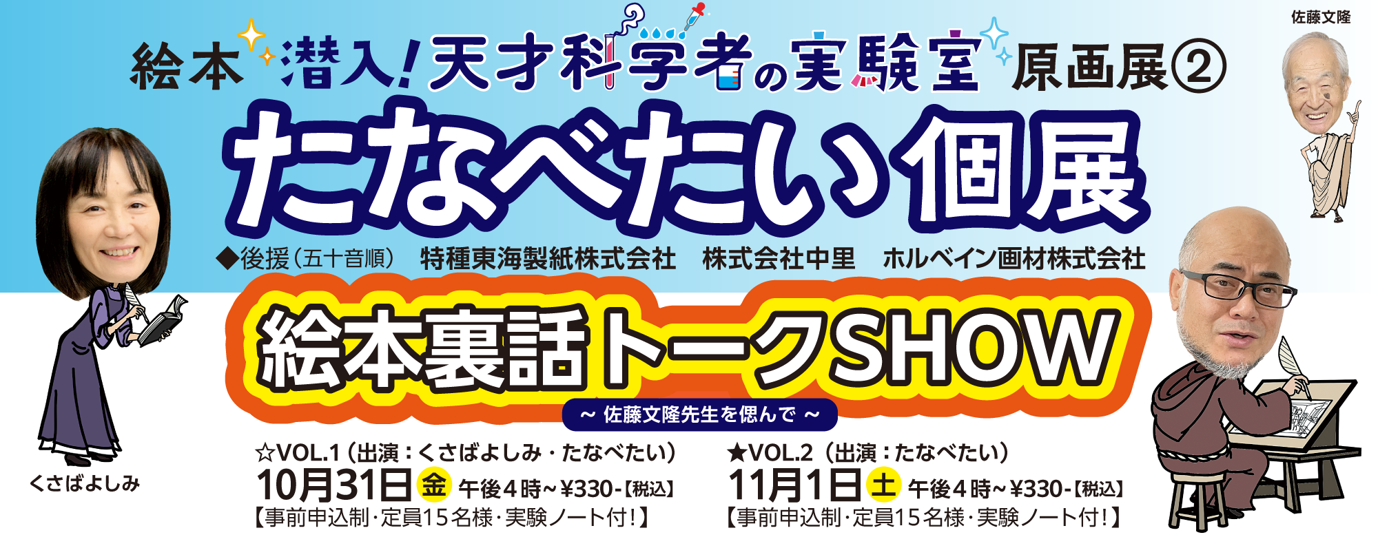 昨年、好評を博した絵本裏話トークSHOWの第2譚!今年は残念ながら9月に急逝された編著者:佐藤文隆先生の想い出話と共に、「第2巻〜生き物はなぜ生まれた?〜」の絵作りの裏話を「くさばよしみ」と「たなべたい」がお話しします。実は各ページの隅から隅まで、すべてのモノを調べた上で描いているのが本書の特徴!表には出てこない著者と漫画家の攻防も含め、秘密の話をコッソリとお届けします!!